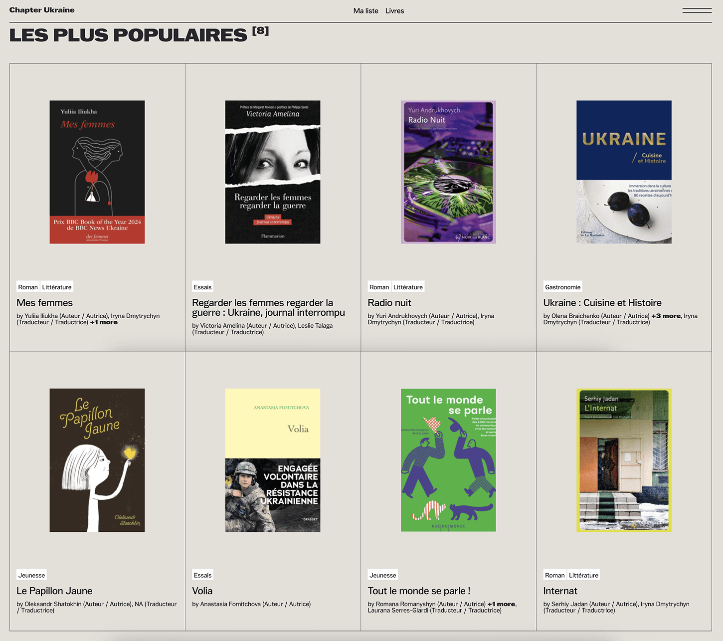 Au moment du lancement, le catalogue français de Chapter Ukraine compte plus de 100 livres provenant de 34 maisons d’édition. La traductrice la plus représentée est Iryna Dmytryshyn, avec 26 livres traduits par ses soins.